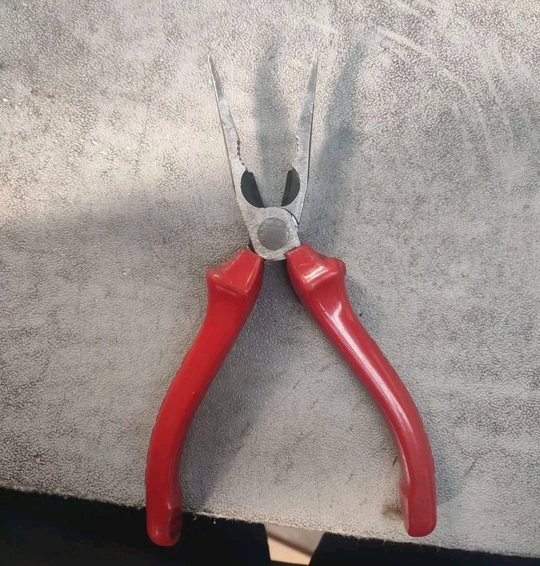 На изображении показаны плоскогубцы с красными ручками, лежащие на светло-серой поверхности. Острые концы плоскогубцев направлены вверх и в стороны, а их тень на фоне создает впечатление, будто у инструмента есть рога, придавая ему сходство с дьяволом или демоном. Красный цвет ручек только усиливает это впечатление. Это необычное сходство делает обычный инструмент забавным и узнаваемым изображением, которое может вызывать ассоциации с чем-то зловещим или мистическим.