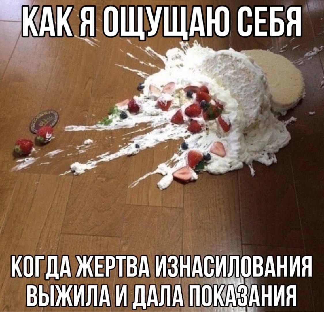 На изображении показан торт, который упал на деревянный пол и разлетелся на куски. Белый крем и бисквит смешались с красными ягодами клубники и синими ягодами черники, создавая живописный беспорядок на полу. Часть крема и ягод разлетелись вокруг основного места падения, создавая брызги. Небольшой круглый след от торта или упаковки также виден на полу слева. В верхней части картинки крупным черным шрифтом на белом фоне написано: «КАК Я ОЩУЩАЮ СЕБЯ». В нижней части картинки, таким же шрифтом, написано: «КОГДА ЖЕРТВА ИЗНАСИЛОВАНИЯ ВЫЖИЛА И ДАЛА ПОКАЗАНИЯ».