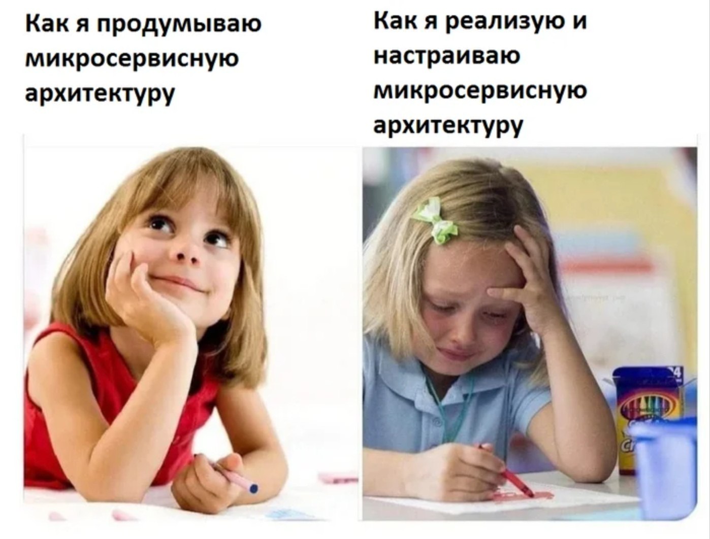 Мем состоит из двух изображений. На левой картинке изображена маленькая девочка, лежащая на полу и мечтательно смотрящая вверх, подперев щеку рукой. Она улыбается, и в руке у неё карандаш. Надпись над этой картинкой гласит: "Как я продумываю микросервисную архитектуру". На правой картинке показана та же девочка, но уже плачущая и с выражением отчаяния, держась за голову. Она сидит за столом и пытается рисовать красным карандашом. Надпись над этой картинкой: "Как я реализую и настраиваю микросервисную архитектуру". Мем отражает разницу между теоретическим планированием и сложной, часто разочаровывающей реальностью реализации сложных проектов, таких как микросервисная архитектура. То есть, как я придумываю микросервисную архитектуру и как я её потом реализую.