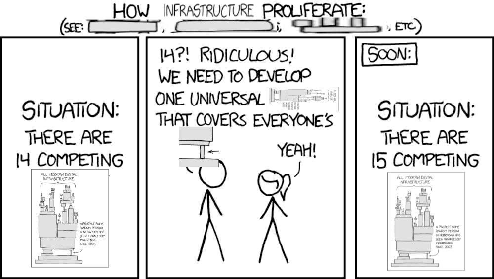 How infrastructure proliferate. See: , , , , etc. Situation: There are 14 competing. All modern digital infrastructure. A project some random person in nebraska has been thanklessly maintaining since 2003. 14?! Ridiculous! We need to develop one universal that covers everyone's. Yeah! Soon: Situation: There are 15 competing. All modern digital infrastructure.