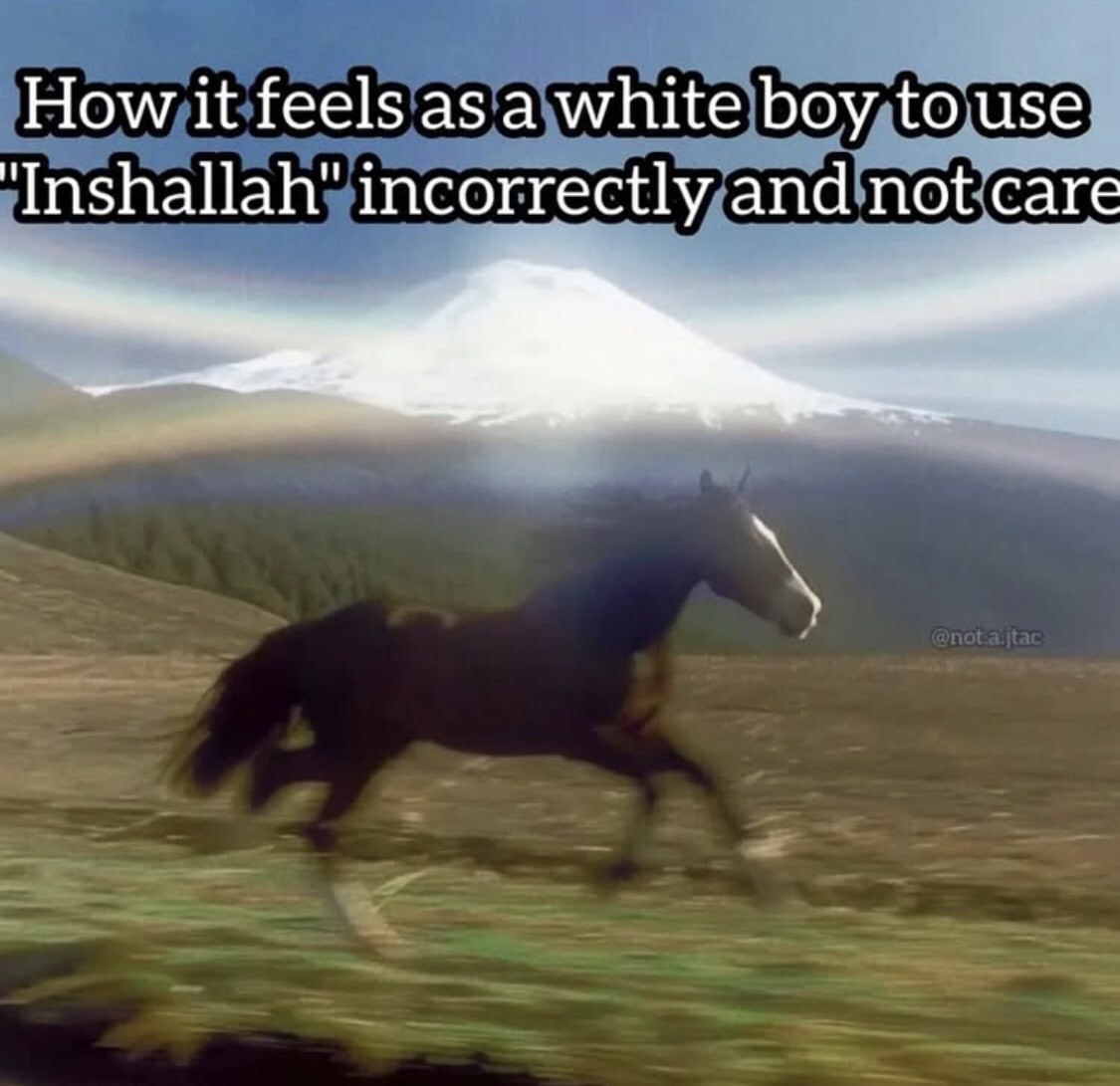 На изображении показан грациозный конь, скачущий галопом по зелёному склону холма. На заднем плане возвышается заснеженная гора, над которой видно легкое радужное сияние. Небо на горизонте чистое, голубое. Текст сверху гласит: "Как это чувствуется, когда белый парень использует "Inshallah" неправильно и ему всё равно" (How it feels as a white boy to use "Inshallah" incorrectly and not care). Это юмористическое наблюдение о культурной апроприации и безразличии к правильному использованию чужих слов.