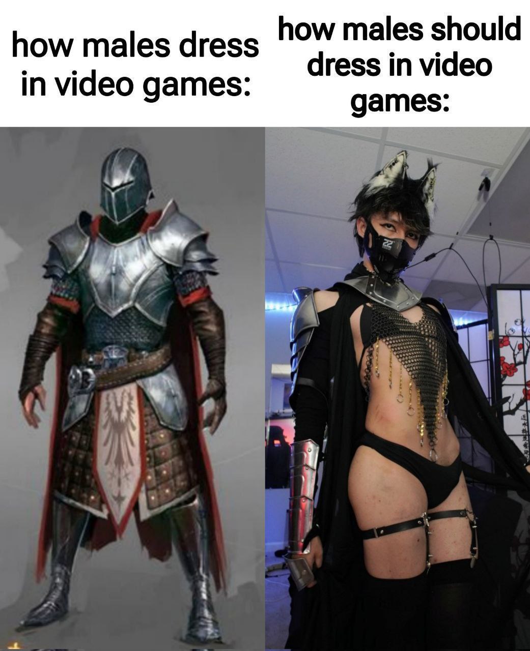 Мем состоит из двух частей, сравнивающих, как "одеваются мужчины в видеоиграх" и "как мужчины должны одеваться в видеоиграх". Слева изображен воин в полном тяжелом доспехе, закрывающем все тело, который выглядит очень защищенным и традиционным для фэнтези. Справа показан мужчина, одетый в откровенный костюм с кошачьими ушками, маской на лице, кольчужной сеткой на груди, черными плавками, подвязками и элементами брони на плечах и предплечьях. Этот образ пародирует стереотипное изображение женских персонажей в играх, где их броня часто бывает минималистичной, несмотря на ее "защитную" функцию. Смысл мема заключается в высмеивании дисбаланса в дизайне одежды для мужских и женских персонажей в видеоиграх, где мужчины обычно выглядят реалистично защищенными, а женщины — сексуализированными.