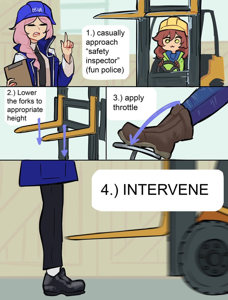 На четырехпанельном меме изображена инструкция, как «вмешаться» в работу инспектора по безопасности. На первой панели молодая девушка в кепке OSHA, рабочей форме и с розовыми волосами указывает пальцем, словно читает лекцию, и держит в руке планшет. Справа от неё, сидящая в кабине погрузчика, другая девушка в желтой каске смотрит на неё. Текст на панели гласит: «1.) casually approach safety inspector (fun police)», что переводится как «1.) небрежно подойти к инспектору по безопасности (полиции веселья)». Вторая панель показывает вилы погрузчика, опускающиеся вниз, с надписью: «2.) Lower the forks to appropriate height» («2.) Опустить вилы на соответствующую высоту»). На третьей панели виден ботинок, нажимающий на педаль газа, с текстом: «3.) apply throttle» («3.) нажать на газ»). Четвертая панель крупным планом показывает ноги девушки-инспектора, к которым быстро приближаются вилы погрузчика, с крупной надписью: «4.) INTERVENE» («4.) ВМЕШАТЬСЯ»).