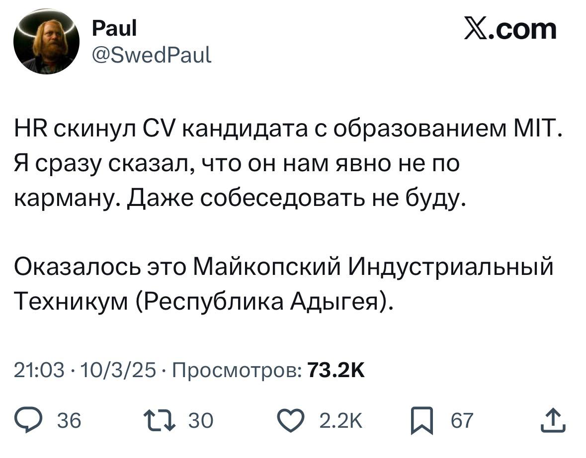 На изображении представлен скриншот поста из социальной сети X, где пользователь Paul с ником @SwedPaul делится забавной историей. Он рассказывает, что HR прислал ему резюме кандидата с образованием MIT, и Пол сразу решил, что такой специалист компании не по карману, отказавшись даже проводить собеседование. Однако позже выяснилось, что "MIT" означает Майкопский Индустриальный Техникум, расположенный в Республике Адыгея. Этот мем высмеивает распространенное восприятие аббревиатур и ожидания, связанные с известными учебными заведениями, такими как Массачусетский технологический институт (MIT), сталкивая их с российской реальностью.