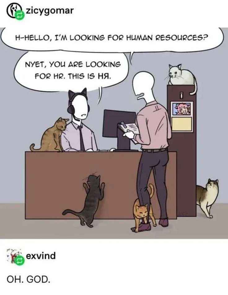 На этом меме изображена сцена в офисе, где человек спрашивает: "H-hello, I'm looking for Human Resources?" (Здравствуйте, я ищу отдел кадров?). Сотрудник за столом, в наушниках с кошачьими ушками, отвечает: "Nyet, you are looking for HR. This is HЯ" (Нет, вы ищете HR. Это HЯ.). Слово "HЯ" (Hya) – это звукоподражание мяуканью, так как весь офис буквально заполонен кошками: кошка сидит на столе рядом с сотрудником, еще одна на полке шкафа, две кошки внизу, одна из которых пытается залезть на стол, а другая трется об ногу посетителя, и еще одна кошка стоит сбоку. Всё это создает комический эффект и игру слов.