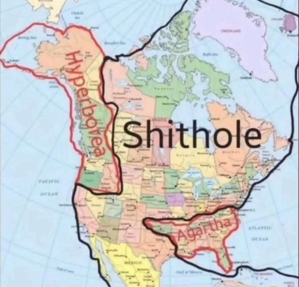 На изображении показана карта Северной Америки, на которой выделены три условные зоны. Западное побережье США и часть Канады обозначены как «Hyperborea» (Гиперборея). Центральная и восточная часть США, а также большая часть Канады и Гренландии, объединены в область под названием «Shithole» (Дыра или Жопа мира). Южные штаты США, выходящие к Мексиканскому заливу и часть Мексики, подписаны как «Agartha» (Агарта). Карта выполнена в примитивном стиле, с грубыми очертаниями и крупными надписями, что придает ей юмористический и сатирический оттенок.