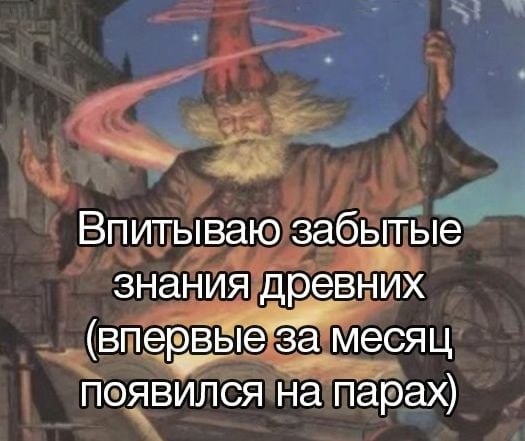 На картинке изображен бородатый старец в остроконечной шляпе, напоминающий могущественного волшебника или мага из фэнтези. Его руки широко раскинуты, а вокруг него видны красные потоки энергии, словно он поглощает или излучает магию. Фон представляет собой ночное небо со звездами и элементами древней архитектуры. Текст на меме гласит: «Впитываю забытые знания древних (впервые за месяц появился на парах)», что в переводе означает «Впитываю забытые знания древних (впервые за месяц появился на парах)». Это юмористическое изображение символизирует студента, который долгое время прогуливал занятия, а затем, появившись на парах, пытается нагнать упущенное и усвоить огромное количество информации, будто он постигает тайны мироздания. Мем высмеивает ситуацию, когда после длительного отсутствия на лекциях человек пытается вникнуть в материал, который уже давно прошел.