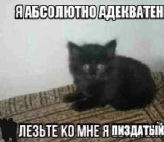 На изображении представлен маленький черный котенок с широко раскрытыми глазами, который сидит на клетчатом покрывале. Над ним и под ним расположены надписи. Сверху написано: «Я абсолютно адекватен», а снизу — «Лезьте ко мне, я пиздатый». Эта фраза, где котенок утверждает свою адекватность, а затем призывает к себе, подчеркивает его уверенность и харизму, несмотря на юный возраст и милый внешний вид. Мем часто используется, чтобы иронично показать самоуверенность или эксцентричность, когда кто-то заявляет о своей адекватности, но при этом ведет себя необычно.