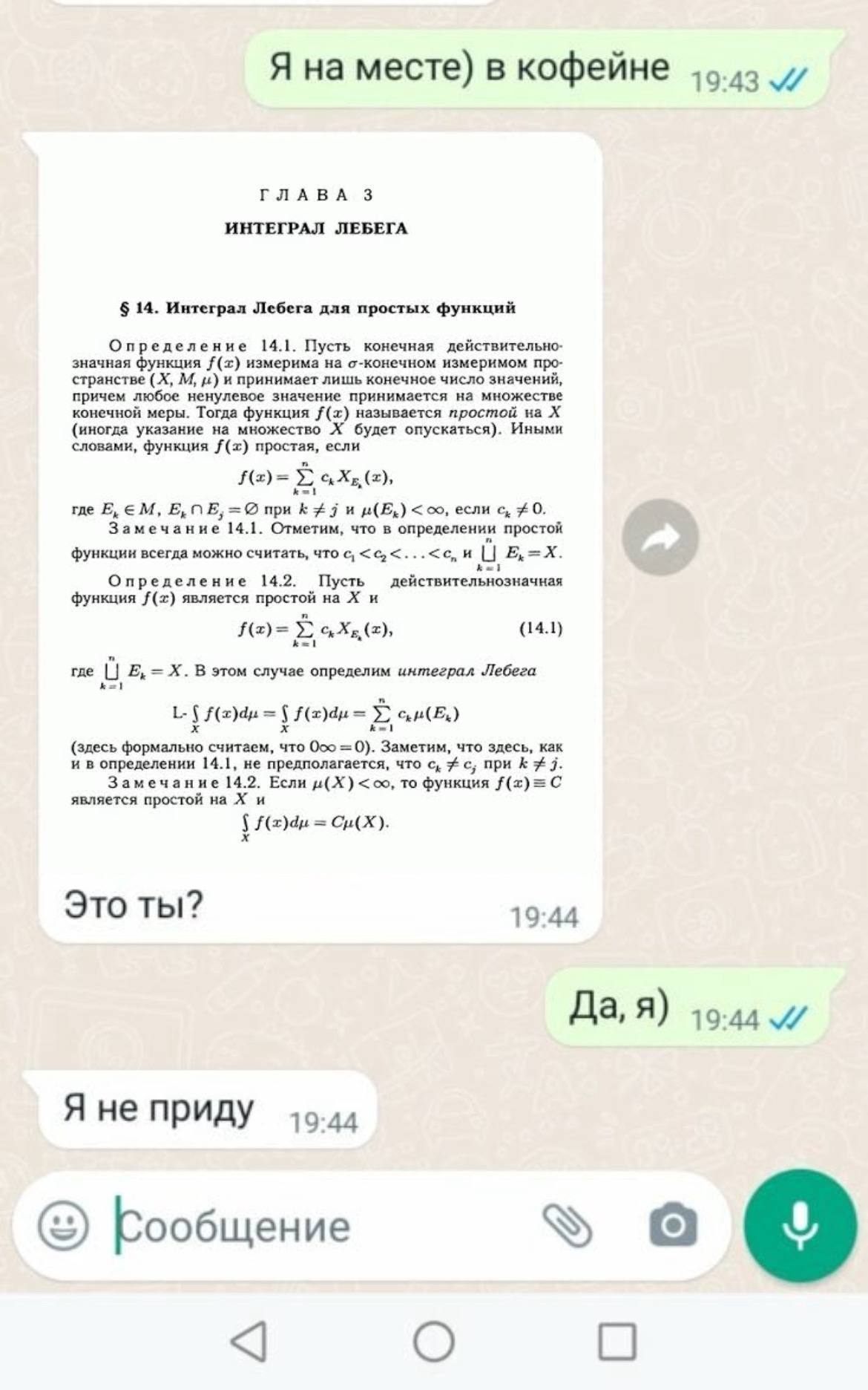 На изображении показан скриншот из мессенджера, где пользователь отправил сообщение "Я на месте) в кофейне". В ответ на это, вместо своего фото, он прикрепил изображение страницы из учебника по математике с формулами и текстом, относящимся к интегралу Лебега. Его собеседник, видимо, озадаченный таким "селфи", спрашивает: "Это ты?". Далее следует ответ "Да, я)" и затем "Я не приду", что добавляет комичности ситуации, ведь "Я на месте) в кофейне" (что переводится как "Я на месте) в кофейне") внезапно превращается в "Я не приду" ("Я не приду"). Возможно, пользователь, находящийся в кофейне, настолько увлечен математикой, что отождествляет себя с учебником, или это просто шутка, демонстрирующая отказ от встречи, замаскированный под "интеллектуальный" юмор.