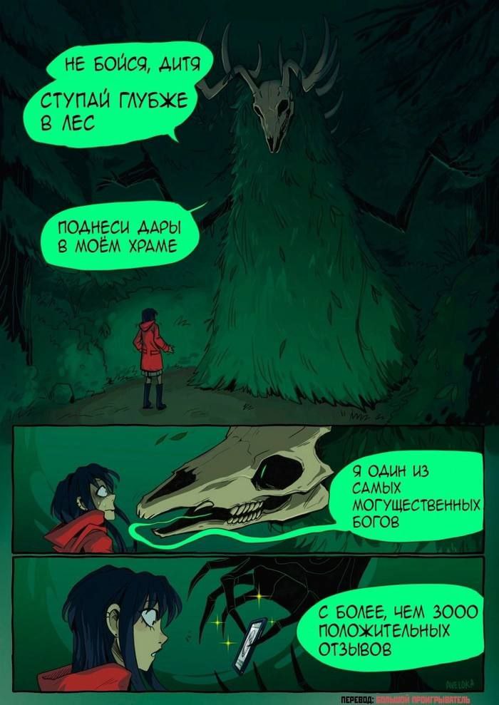 На этом изображении из трёх кадров показана девушка в красном плаще, которая встречается с огромным лесным духом с черепом оленя вместо головы и телом, похожим на хвойное дерево. Лесной дух приглашает девушку ступить глубже в лес и поднести дары в его храме. На следующем кадре лесной дух сообщает, что он один из самых могущественных богов, а на последнем кадре он подтверждает это, демонстрируя девушке свой смартфон с более чем 3000 положительных отзывов. Иными словами, он является “богом” с рейтингом в интернете.