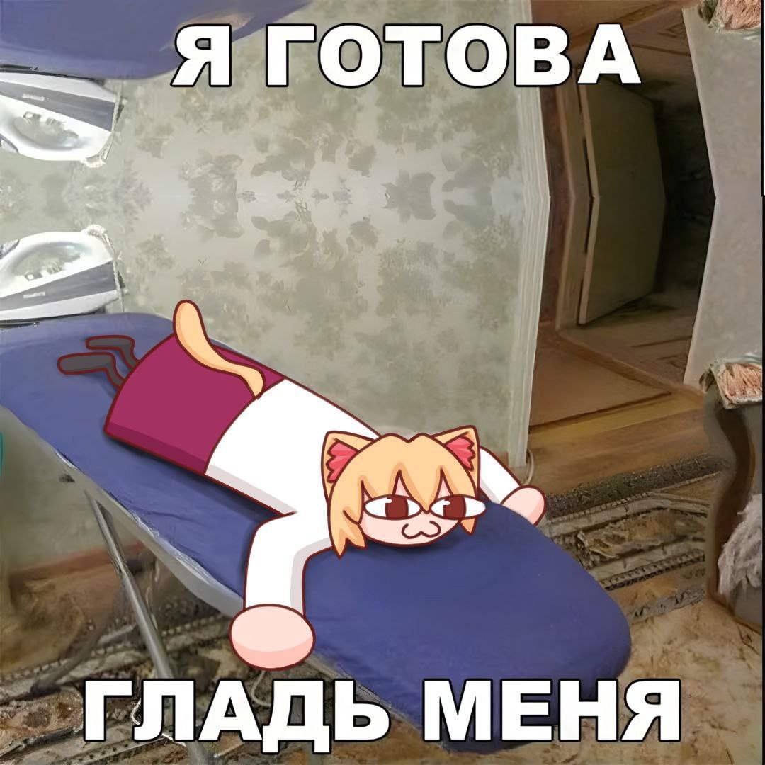 На изображении показана Неко-Арк, персонаж из серии Tsukihime и Carnival Phantasm, лежащая на гладильной доске. Она выглядит очень расслабленной и готовой к тому, чтобы ее погладили. Фон представляет собой домашнюю комнату с обоями и дверным проемом. Надпись на меме гласит: «Я готова. Глади меня» — это фраза, которую пользователи часто используют в шутках, когда они готовы к чему-то или просто хотят ласки.