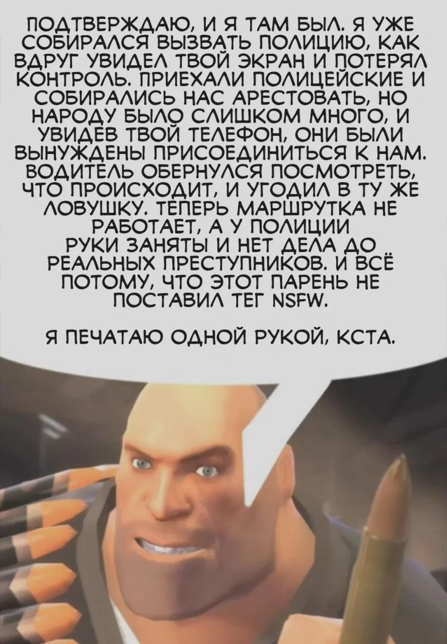 Подтверждаю, и я там был. Я уже собирался вызвать полицию, как вдруг увидел твой экран и потерял контроль. Приехали полицейские и собирались нас арестовать, но народу было слишком много, и увидев твой телефон, они были вынуждены присоединиться к нам. Водитель обернулся посмотреть, что происходит, и угодил в ту же ловушку. Теперь маршрутка не работает, а у полиции руки заняты и нет дела до реальных преступников. И всё потому, что этот парень не поставил тег NSFW. Я печатаю одной рукой, кстати.