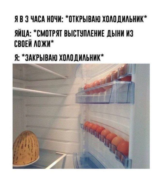 Я в 3 часа ночи: *открываю холодильник*. Яйца: *смотрят выступление дыни из своей ложи*. Я: *закрываю холодильник*.