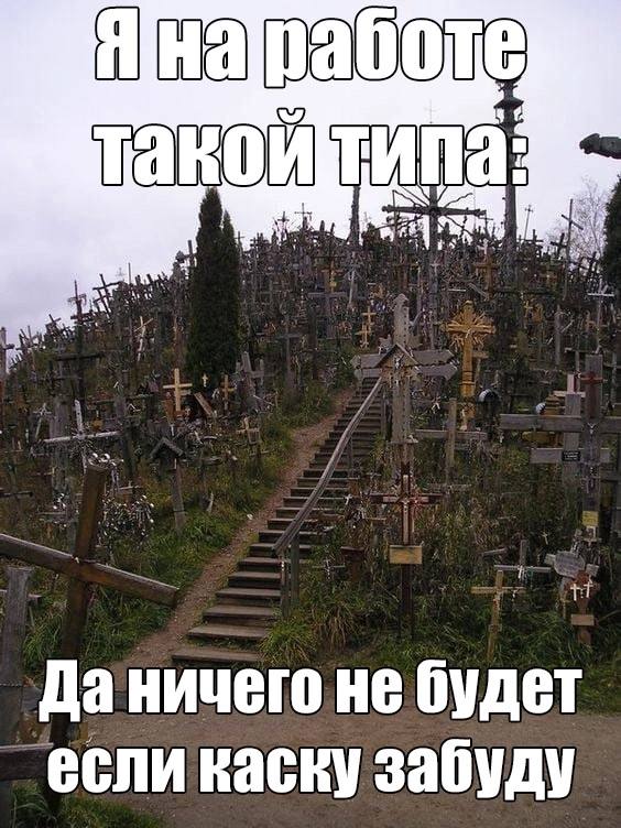 На изображении показан холм, полностью покрытый тысячами крестов разных форм и размеров, сделанных из дерева, металла и камня. Через центр холма проходит узкая тропинка с лестницей, ведущая на вершину. На фоне этого жуткого пейзажа размещены две надписи. Вверху надпись «Я на работе такой типа:» (Я на работе такой типа:), а внизу – «Да ничего не будет если каску забуду» (Да ничего не будет, если каску забуду). Этот мем используется для ироничного изображения ситуаций, когда человек пренебрегает правилами безопасности или важными мерами предосторожности, не думая о возможных фатальных последствиях. Холм с крестами символизирует места захоронений, подчёркивая трагический исход подобной беспечности.
