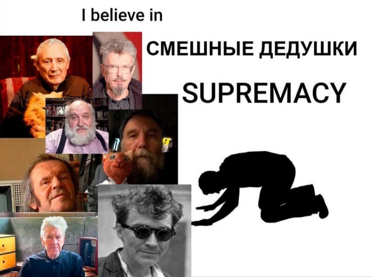 Мем "I believe in смешные дедушки supremacy" изображает несколько фотографий пожилых мужчин, вероятно, известных личностей, расположенных в левой части изображения. Среди них узнаваемы, например, Дэвид Линч и Александр Дугин. В правой части мем содержит текст на английском языке "I believe in" (Я верю в) и "SUPREMACY" (превосходство), а также фразу на русском языке "СМЕШНЫЕ ДЕДУШКИ". В нижнем правом углу изображен черный силуэт человека, стоящего на коленях в поклоне, что символизирует преклонение перед "смешными дедушками". Это указывает на высшую степень уважения или восхищения этими мужчинами.