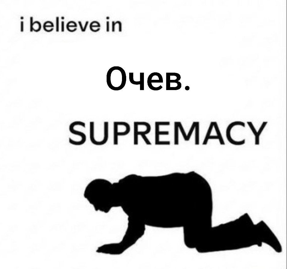 Мем представляет собой изображение, выполненное в черно-белых тонах. В верхней части картинки расположен текст на английском языке: "i believe in" (Я верю в). Ниже, по центру, набран крупным черным шрифтом текст на русском языке: "Очев." (Очевидно.), а еще ниже, снова на английском: "SUPREMACY" (превосходство). В нижней части мема изображен силуэт человека, стоящего на четвереньках. Этот мем используется для выражения твердой и неоспоримой веры в какую-либо идею или концепцию, которая является, по мнению автора, "очевидно" превосходящей.