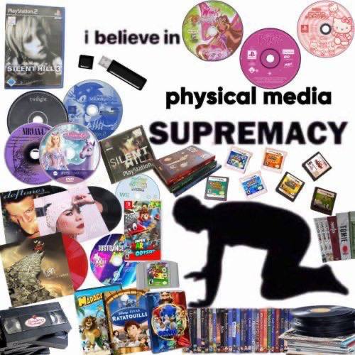 На изображении представлено множество различных физических носителей информации, таких как диски для PlayStation 2, PlayStation 3, Nintendo Wii, картриджи Nintendo 64, кассеты VHS, виниловые пластинки, книги, флеш-накопители и т.д. В центре коллажа крупным шрифтом написано «I believe in physical media supremacy» («Я верю в превосходство физических носителей»), а снизу расположен силуэт человека, который склонился на коленях, словно преклоняясь перед изображенным обилием носителей. Это мем, который выражает ностальгию и предпочтение физическим носителям информации в противовес цифровым форматам.