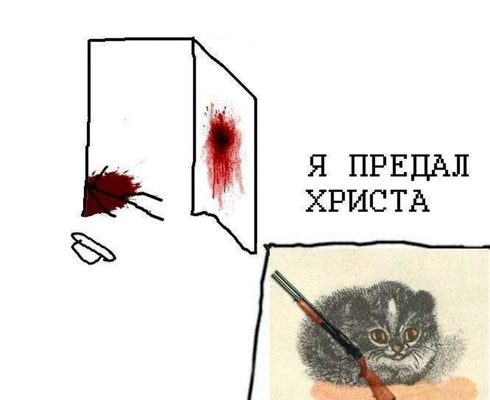 Мем изображает нелепую и мрачную ситуацию. В левой части изображения, на белом фоне, нарисована схематичная комната или угол, где на стене видны кровавые брызги, а на полу лежит лужа крови. Рядом с ней лежит какой-то предмет, похожий на шляпу или стопку бумаги. Это создает впечатление, что здесь произошло что-то трагическое, возможно, самоубийство или убийство. На стене справа, также изображенной схематично, видны новые кровавые брызги, что может указывать на продолжение или эхо произошедшего. В правой части изображения, снизу, находится рисунок милого, пушистого котенка, который держит в лапах ружье. Над котенком текст: "Я предал Христа". Контраст между мрачной сценой и милым котенком с ружьем, а также неожиданный религиозный контекст, создают абсурдный и черный юмор.