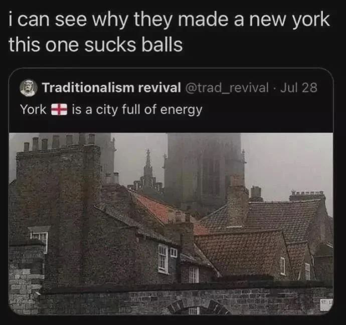 Мем состоит из скриншота поста в Твиттере, над которым добавлен комментарий пользователя. В твите опубликована фотография старинных крыш и зданий Йорка, Англия, в туманную или пасмурную погоду. Надпись на изображении гласит: "Я понимаю, почему они сделали Нью-Йорк, этот отстой". Подпись к изображению в твите гласит: "Йорк — город, полный энергии". Мем иронизирует над тем, насколько английский Йорк выглядит "энергично" на этой фотографии.