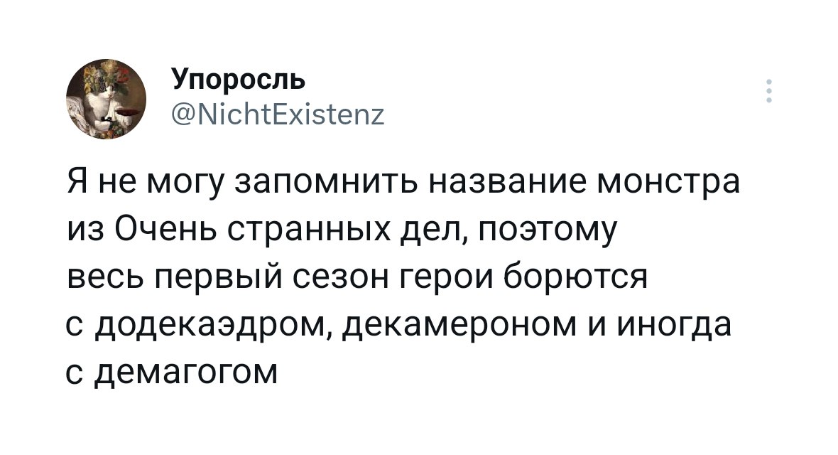 На изображении показан скриншот твита пользователя "Упоросль" с ником @NichtExistenz. В твите пользователь делится своей проблемой с запоминанием имени монстра из сериала "Очень странные дела". Вместо правильного названия, он в шутку называет монстра додекаэдром, декамероном и демагогом. Это выражение показывает, что человек не может запомнить труднопроизносимые или необычные названия, и использует созвучные, но абсолютно не относящиеся к делу слова. Мем описывает частую ситуацию, когда забываешь имя персонажа или предмета из фильма или книги и пытаешься подобрать что-то похожее по звучанию, но получается что-то совершенно абсурдное и смешное. Это может быть близко многим зрителям сериала, которые также испытывали трудности с названием Демогоргона.