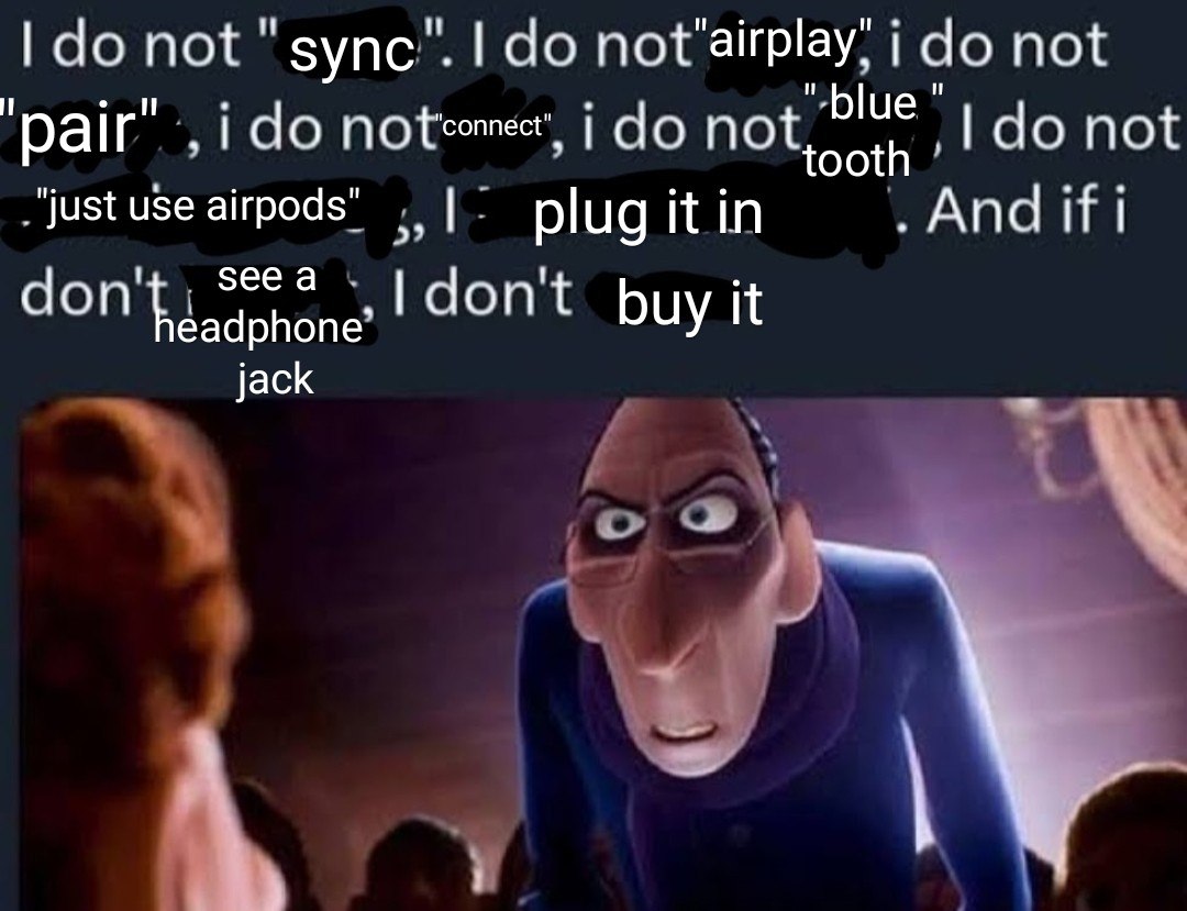 I do not "sync". I do not "airplay". I do not "pair". I do not "connect". I do not "bluetooth". I do not "just use airpods". I plug it in. And if i don't see a headphone jack, I don't buy it.