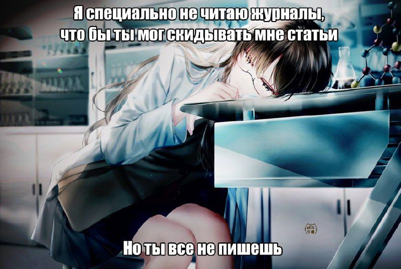 На изображении показана молодая девушка в лабораторном халате и очках, которая, кажется, устала и задремала, прислонившись головой к столу. Она находится в помещении, напоминающем лабораторию, о чем свидетельствует пробирка и молекулярная модель на столе позади нее. Девушка с длинными темными волосами и очень бледной кожей. На ней очки в красной оправе. Сверху и снизу наложен текст, который переводится как «Я специально не читаю журналы, чтобы ты мог скидывать мне статьи. Но ты все не пишешь». Этот мем часто используется для иллюстрации ожидания ответа или действия от другого человека, которые так и не происходят, особенно в контексте общения или обмена информацией, а также чтобы показать желание взаимодействия. Девушка на картинке похожа на ученого или исследователя, подчеркивая тему интеллектуального обмена.
