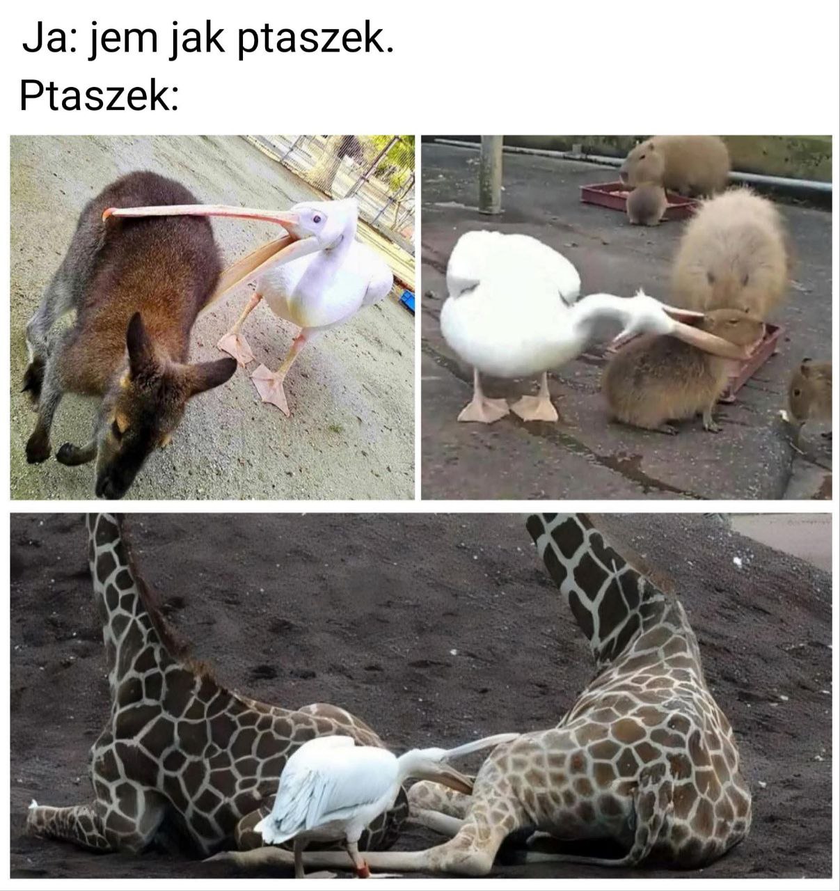 Мем состоит из четырех изображений, расположенных в сетке 2х2, с текстовым описанием сверху. На верхнем левом снимке показан пеликан, выхватывающий еду прямо изо рта кенгуру. На верхнем правом снимке другой пеликан нагло достает корм из миски капибары, игнорируя ее присутствие. Нижняя часть мема представляет собой одну большую фотографию, на которой пеликан активно щиплет шею жирафа, который лежит на земле. Текстовая часть мема гласит: «Я: ем как пташка. Пташка:», что создает юмористический контраст между представлением человека о «еде как пташка» и реальным, часто агрессивным поведением птиц при добыче пищи.