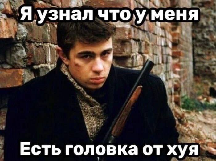На изображении показан молодой человек, стоящий на фоне кирпичной стены с ружьём в руках. Это кадр из известного российского фильма «Брат», где главный герой предстаёт в типичном для себя образе. У парня смущенное выражение лица, небольшая ссадина на щеке и он одет в тёмное пальто или пиджак и свитер. Надпись на меме «Я узнал что у меня есть головка от хуя» (I found out I have a dick head) дополняет образ и создаёт комический эффект, делая мем популярным в социальных сетях и на юмористических платформах.