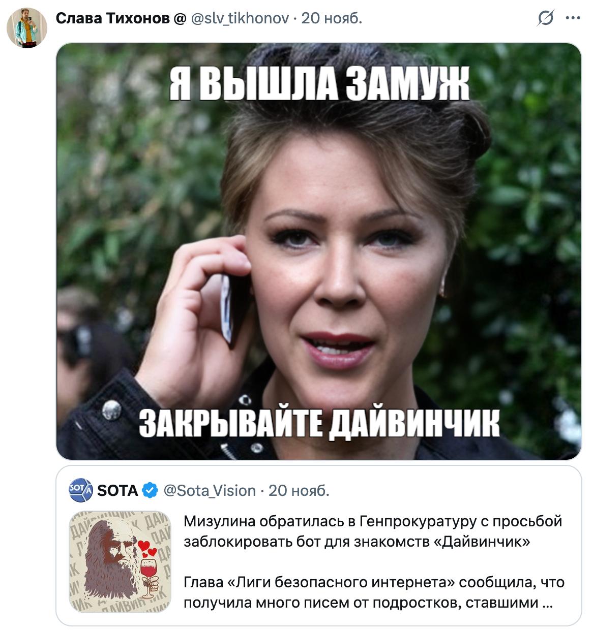 На изображении представлен мем с женщиной, которая говорит по телефону. Её лицо крупным планом выражает некое удивление или важность момента. Над ней и под ней расположен текст белыми буквами на черном фоне. Сверху написано «Я ВЫШЛА ЗАМУЖ», а снизу — «ЗАКРЫВАЙТЕ ДАЙВИНЧИК». Это отсылка к ситуации, когда человек, достигнув определенного личного события, такого как замужество, призывает закрыть некий ресурс, в данном случае бот для знакомств «Дайвинчик», как будто он ему больше не нужен. Судя по новости внизу, Мизулина обратилась в Генпрокуратуру с просьбой заблокировать бот для знакомств «Дайвинчик» из-за писем от подростков.