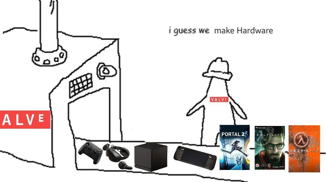 Мем изображает, как компания Valve, известная своими культовыми видеоиграми, также занимается производством аппаратного обеспечения. На левой стороне мема изображен стилизованный под логотип Valve кран, из которого сыпятся различные устройства: контроллер Steam Controller, шлем виртуальной реальности Valve Index, Steam Link и портативная консоль Steam Deck. На правой стороне мема нарисован человечек, одетый в шляпу-кран (символ Valve), который смотрит на обложки игр Portal 2, Half-Life 2 и Half-Life. Над человечком расположена надпись: «i guess we make Hardware» («Полагаю, мы делаем железо»), что отражает удивление или иронию по поводу расширения деятельности Valve за пределы разработки игр.