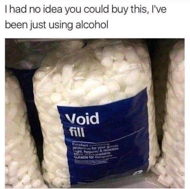 На изображении представлен мем с текстовой частью сверху и фотографией внизу. На фотографии виден большой прозрачный пакет, наполненный белыми гранулами — это упаковочный материал, так называемый наполнитель пустот. На синей этикетке пакета крупным шрифтом написано "Void fill", что в переводе с английского означает "заполнитель пустот". Верхняя часть мема содержит текст: "I had no idea you could buy this, I've been just using alcohol", что переводится как "Я понятия не имел, что это можно купить, я просто использовал алкоголь". Смысл мема заключается в игре слов, где "void" (пустота) из названия наполнителя ассоциируется с экзистенциальной пустотой или скукой, которую герой мема, по его словам, раньше заполнял алкоголем.
