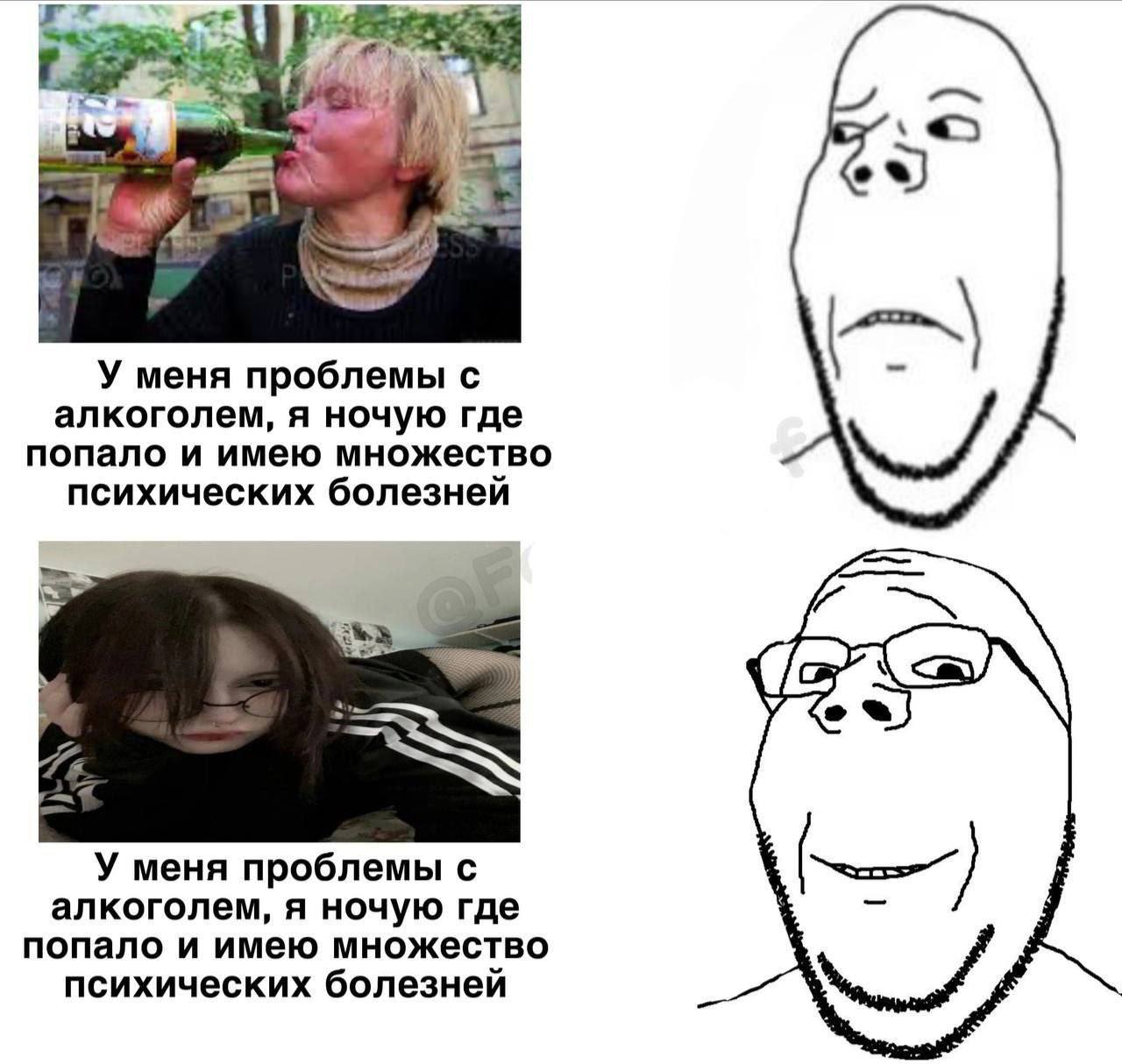 Мем состоит из четырех частей. В левой верхней части изображена пожилая женщина с короткими светлыми волосами, которая пьет из бутылки. Под ней расположен текст: "У меня проблемы с алкоголем, я ночую где попало и имею множество психических болезней". В правой верхней части изображен wojak с грустным выражением лица и небольшим количеством волос на подбородке. В левой нижней части мема показана молодая девушка в очках с длинными темными волосами, лежащая на кровати или другой поверхности. Она одета в черную кофту с белыми полосками на рукавах и чулки в сетку. Под ней находится тот же текст: "У меня проблемы с алкоголем, я ночую где попало и имею множество психических болезней". В правой нижней части изображен другой wojak, который улыбается и носит очки, у него более густая борода. Мем сравнивает реакции на признание в алкоголизме, бездомности и психических заболеваниях в зависимости от того, кто об этом говорит: пожилая женщина или молодая привлекательная девушка. Грустный wojak сверху символизирует, что к проблемам пожилой женщины относятся с печалью или осуждением, в то время как улыбающийся wojak снизу в очках указывает на то, что те же проблемы у молодой девушки могут восприниматься с симпатией или даже привлекательностью, возможно, из-за эстетизации страданий в определенных кругах.