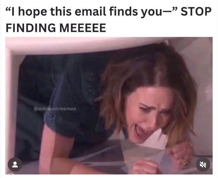На изображении показана женщина, скорее всего, актриса Сара Полсон, которая отчаянно пытается спрятаться или убежать. Она находится под какой-то поверхностью, возможно, столом или кроватью, и смотрит вверх с выражением ужаса и мольбы. Ее рот открыт в крике, а руки сжаты в кулаки, что указывает на сильное эмоциональное напряжение или страх. Верхняя часть мема содержит текст на английском языке: "I hope this email finds you—" STOP FINDING MEEEEE (Я надеюсь, что это письмо найдет вас — ПРЕКРАТИТЕ МЕНЯ НАХОДИТЬ). Это создает юмористический контраст между формальным началом электронного письма и желанием скрыться от него, что отражает общую усталость от работы или нежелание отвечать на рабочие сообщения. Мем "I hope this email finds you" отражает распространённое чувство отчаяния, которое многие испытывают, получая рабочие электронные письма, особенно когда хочется отдохнуть или избежать обязанностей. Выражение лица женщины прекрасно передает это стремление убежать от назойливых уведомлений и запросов, делая мем актуальным для тех, кто ищет способы уклониться от рабочей переписки.