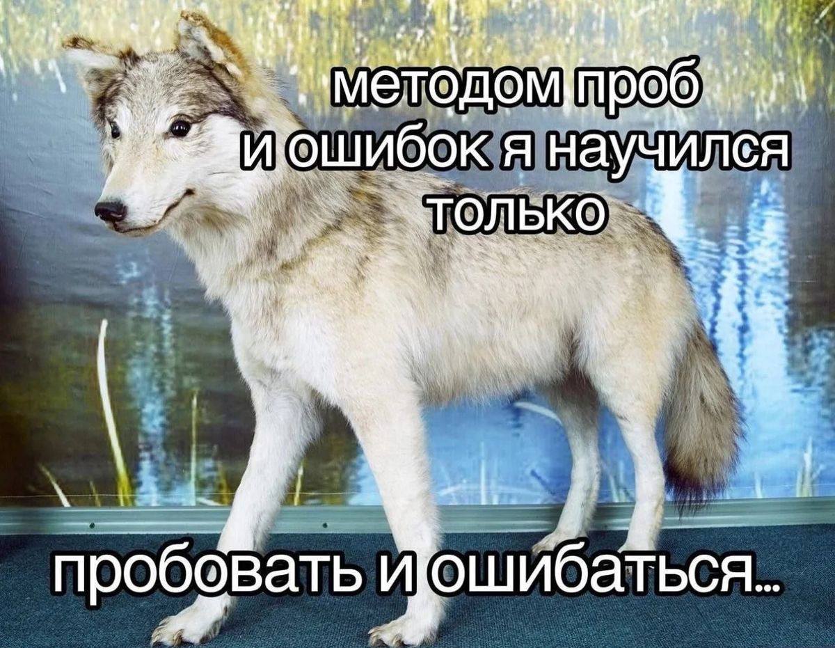 На картинке изображено чучело волка на фоне пейзажа, имитирующего лес и воду. Волк стоит в полуобороте, смотрит немного в сторону, у него слегка ухмыляющаяся морда. На изображении есть текст, который гласит, что методом проб и ошибок кто-то научился только пробовать и ошибаться. Изображение выглядит забавно и иронично.