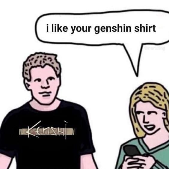 На меме изображены два человека: мужчина и женщина. Мужчина в чёрной футболке с надписью "Kenshi" стоит слева. Женщина, улыбаясь, смотрит в свой телефон, а над ней в облачке текста написана фраза: "I like your genshin shirt" (Мне нравится твоя футболка с Геншином). Мем показывает забавную ситуацию, когда кто-то путает игру Kenshi с Genshin Impact, возможно, из-за поверхностного сходства в произношении или просто по ошибке.