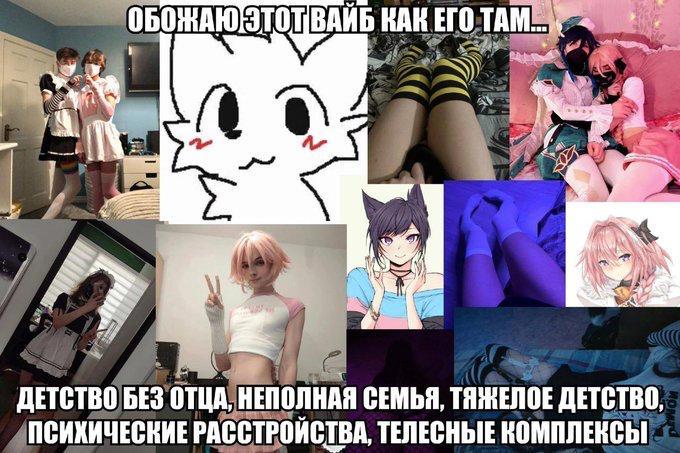На изображении представлен коллаж из восьми картинок. В центре верхней части находится рисунок мультяшного кота с красными щеками. Вокруг него расположены фотографии и иллюстрации в "анимешном" стиле. Среди них две пары молодых людей, одетых в костюмы горничных и маски, причём две девушки сидят на кровати. Также показаны ноги в чёрно-жёлтых полосатых чулках и в белых чулках на фиолетовом фоне. Есть крупный план девушки с розовыми волосами, показывающей знак "мир", и отражение другой девушки в костюме горничной в зеркале. В правом нижнем углу — ещё одна иллюстрация девушки с розовыми волосами в стиле аниме. В самом низу коллажа размещена надпись на русском языке, которая выражает иронию или сарказм по поводу людей, которые проявляют феминные черты. Все эти изображения объединены надписью "обожаю этот вайб как его там..." в верхней части.
