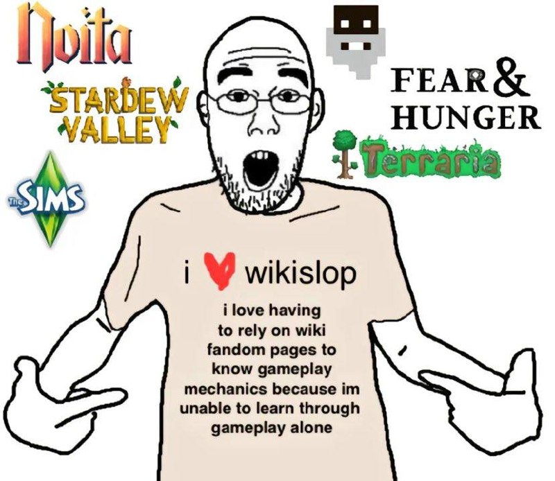 На изображении представлен мем Wojak с открытым ртом, который указывает пальцами на свою футболку. На футболке написано «I love wikislop» и ниже текст «I love having to rely on wiki fandom pages to know gameplay mechanics because I'm unable to learn through gameplay alone». Это означает «Я люблю полагаться на вики-страницы фэндома, чтобы узнать механику игры, потому что я не могу учиться в процессе игры один». Вокруг Wojak'а расположены логотипы популярных игр: Noita, Stardew Valley, The Sims, Terraria, Minecraft и Fear & Hunger, которые зачастую требуют обращения к внешним источникам для полного понимания механик. Мем высмеивает или признает сложность некоторых игр, которая вынуждает игроков искать информацию на вики-ресурсах, вместо того чтобы полностью осваивать ее самостоятельно.