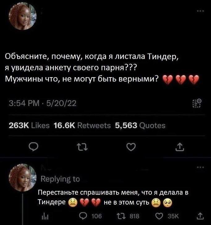 На изображении представлен скриншот из Твиттера, на котором пользовательница с аватаром темнокожей девушки с кудрявыми волосами задает вопрос: "Объясните, почему, когда я листала Тиндер, я увидела анкету своего парня??? Мужчины что, не могут быть верными?" (Why, when I was swiping Tinder, did I see my boyfriend's profile??? Men, what, can't be faithful?). Под этим твитом видно, что он набрал 263 тысячи лайков и 16.6 тысячи ретвитов. Ниже опубликован ответ этой же девушки, где она пишет: "Перестаньте спрашивать меня, что я делала в Тиндере. Не в этом суть" (Stop asking me what I was doing on Tinder. That's not the point). Таким образом, мем высмеивает двойные стандарты и фокусируется на неверности парня, отвлекая внимание от того, что девушка сама пользовалась приложением для знакомств, находясь в отношениях. Мем "Я увидела анкету своего парня в Тиндере" стал вирусным, так как затрагивает тему измен и лицемерия в отношениях, а также забавную попытку девушки оправдаться. Он часто используется для иллюстрации ситуаций, когда люди пытаются переложить вину, игнорируя собственные ошибки, или когда очевидные вопросы остаются без ответа из-за переключения внимания на менее важные детали.