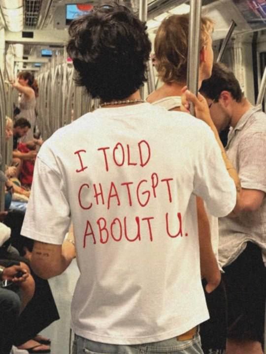 На этом изображении мы видим человека со спины, едущего в метро. На его белой футболке красными буквами написано: "I TOLD CHATGPT ABOUT U." — в переводе на русский это означает: «Я рассказал ChatGPT о тебе». Вокруг него находятся другие пассажиры метро, некоторые из них держатся за поручни. Стрижка мужчины на переднем плане очень объемная и пышная, а на шее у него можно заметить бусы.