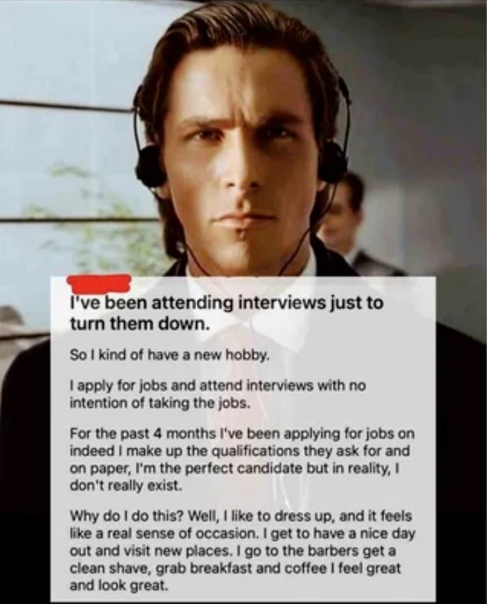 На изображении представлен кадр из фильма «Американский психопат» с Кристианом Бэйлом в главной роли, где его персонаж, Патрик Бейтман, сидит в наушниках, напряженно глядя вперед. На переднем плане расположен текстовый блок, в котором от первого лица рассказывается о необычном хобби: человек ходит на собеседования, чтобы затем отказывать в работе. Он подает заявки на вакансии, придумывая несуществующие квалификации, и, будучи идеальным кандидатом на бумаге, не имеет намерения принимать предложения о работе. Причина такого поведения в том, что человеку нравится наряжаться, посещать новые места, бриться, завтракать и пить кофе, чтобы чувствовать себя прекрасно и выглядеть отлично. Эта история отражает желание добавить смысла или приятных ритуалов в повседневную жизнь, используя собеседования как повод для самовыражения и получения удовольствия от процесса, а не от результата.