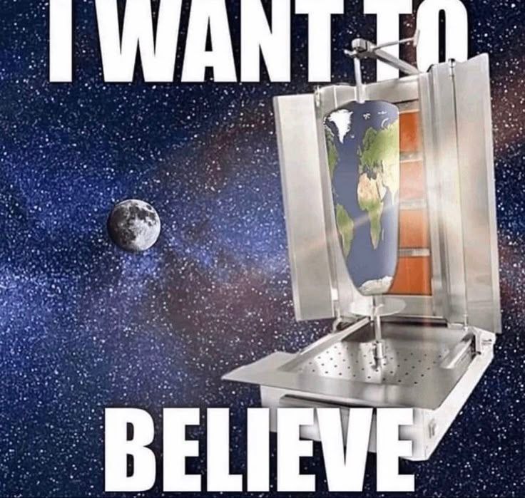 На изображении представлен гибрид нашей планеты Земля и вертела для шаурмы. Земля, имеющая свою привычную форму, насажена на вертел и находится в вертикальном положении. На заднем фоне — глубокий космос, усыпанный звёздами, и маленькая Луна, скромно висящая в левой части. Надпись «I want to believe» или «Я хочу верить» наводит на мысль о том, что это изображение — забавная иллюстрация к какой-то необычной теории заговора или просто фантазия на тему необычного строения мира.