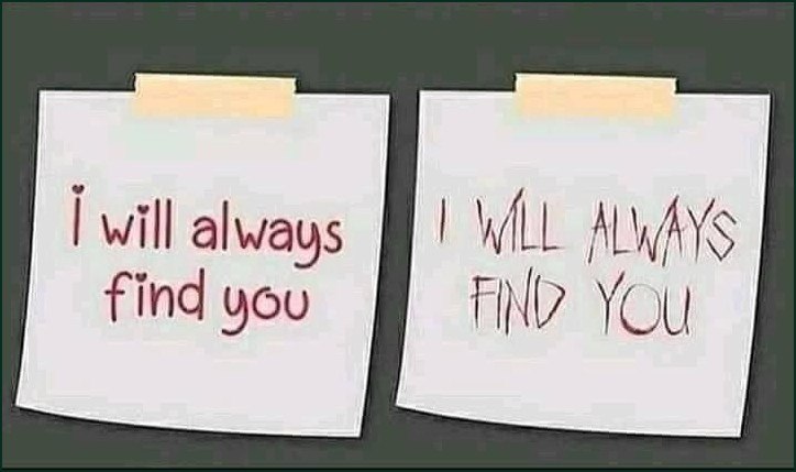 На изображении показаны две приклеенные к стене записки с одинаковой фразой «I will always find you» («Я всегда найду тебя»), но написанные по-разному. Левая записка, написанная округлым красным шрифтом, выглядит как милое и романтичное послание. Правая записка, написанная угловатым и неразборчивым почерком, выглядит как угроза или предупреждение, создавая ощущение напряжения и даже страха. Этот контраст в восприятии одной и той же фразы в зависимости от стиля письма делает картинку забавной.