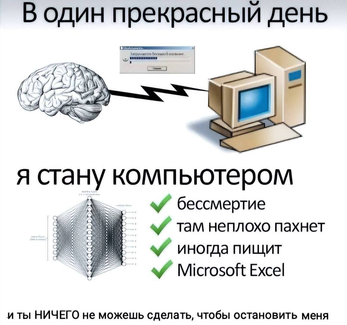 На изображении представлен мем, на котором человеческий мозг подключается к старому компьютеру с помощью молнии. Сверху надпись "В один прекрасный день", а снизу "Я стану компьютером" и список преимуществ: бессмертие, "там неплохо пахнет", "иногда пищит" и "Microsoft Excel". Также снизу есть надпись "и ты НИЧЕГО не можешь сделать, чтобы остановить меня". Все это символизирует стремление мозга к цифровому бессмертию и переносу сознания в компьютерную систему. Этот мем часто используется для ироничного выражения желаний или амбиций, которые кажутся одновременно грандиозными и абсурдными, подчеркивая веру в технологии и их возможности. Мем "Я стану компьютером" высмеивает идею о том, что цифровизация может решить все проблемы, включая смертность, и при этом предлагает довольно приземленные и комичные преимущества, такие как "Microsoft Excel". Он отражает смесь надежды и юмора по отношению к будущему технологий и искусственного интеллекта.