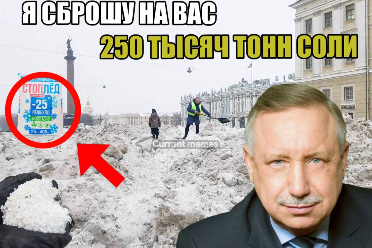 Мем изображает коллаж с губернатором Санкт-Петербурга Александром Бегловым и заснеженными улицами города, усыпанными реагентами. На переднем плане справа крупным планом показано лицо Александра Беглова с ухмылкой. Слева внизу на переднем плане чья-то рука в черной перчатке держит горсть белых гранул, похожих на соль или противогололедный реагент. Красная стрелка указывает от этих гранул на крупный пакет противогололедного реагента "СТОПЛЁД -25" в левой части изображения. На заднем плане виден заснеженный город, покрытый большими сугробами, с дворцами и колонной вдалеке. Посреди этих сугробов стоит дворник с лопатой и маленькая фигурка ребенка, что подчеркивает масштабы завалов снега и реагентов. Сверху надпись, как будто цитирующая Беглова: "Я сброшу на вас 250 тысяч тонн соли".