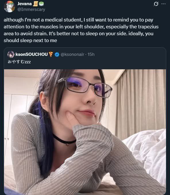 На изображении представлен скриншот из Твиттера, где пользователь @Immerscary пишет: «Хотя я не студент-медик, я все же хочу напомнить вам, чтобы вы обратили внимание на мышцы в вашем левом плече, особенно на область трапеции, чтобы избежать напряжения. Лучше не спать на боку. В идеале, вы должны спать рядом со мной». Ниже этого твита, в цитировании, пользователь @ksononair опубликовал свою фотографию. На фото изображена девушка в очках, одетая в серый свитер с длинными рукавами, лежащая на кровати и подпирающая подбородок рукой. У нее черные волосы с фиолетовыми прядями, а на шее — черный чокер. За спиной у нее виднеется белая простыня и белые шторы. Выражение ее лица немного загадочное, но в то же время кокетливое, как будто она приглашает к себе, в продолжение текста из твита сверху. Эта картинка, по всей видимости, является мемом, где верхний твит дает “медицинский совет” или просто совет по комфортному сну, который переходит в флирт. Вторая часть, с фотографией девушки, выступает как визуальный ответ или иллюстрация к этой фразе. Выражение ее лица и поза идеально подходят под концовку “в идеале, ты должен спать рядом со мной”, создавая юмористический и немного пикантный контраст между началом твита и его окончанием, подкрепленным изображением.