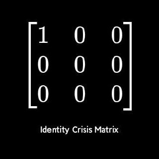 На изображении представлена матрица 3x3, в которой в верхнем левом углу находится единица, а все остальные элементы равны нулю. Под матрицей белым текстом на черном фоне написано "Identity Crisis Matrix", что переводится как «Матрица кризиса идентичности». Эта шутка обыгрывает математическое понятие единичной матрицы, где главная диагональ состоит из единиц, а все остальные элементы равны нулю, и соотносит её с состоянием кризиса идентичности, где только одна «единица» (смысл или цель) осталась, а всё остальное «обнулилось».