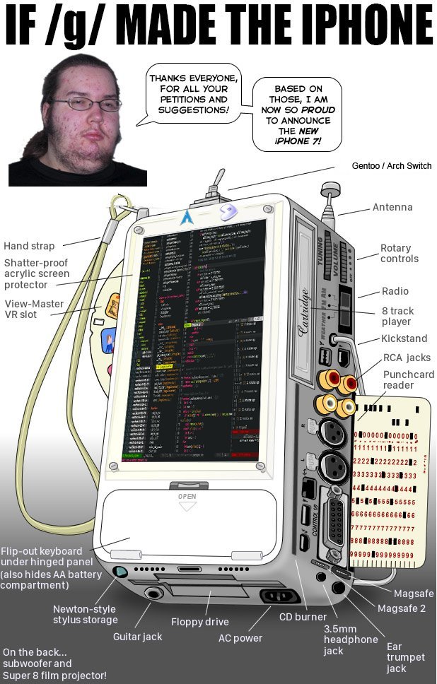 If /g/ made the iPhone. Thanks everyone, for all your petitions and suggestions! Based on those, I am now so proud to announce the new iPhone 7! Gentoo / Arch switch. Antenna. Rotary controls. Radio. 8 track player. Kickstand. RCA jacks. Punchcard reader. Hand strap. Shatter-proof acrylic screen protector. View-master VR slot. Flip-out keyboard under hinged panel (also hides AA battery compartment). Newton-style stylus storage. Guitar jack. Floppy drive. AC power. CD burner. 3.5mm headphone jack. Ear trumpet jack. On the back... subwoofer and Super 8 film projector! Magsafe. Magsafe 2.