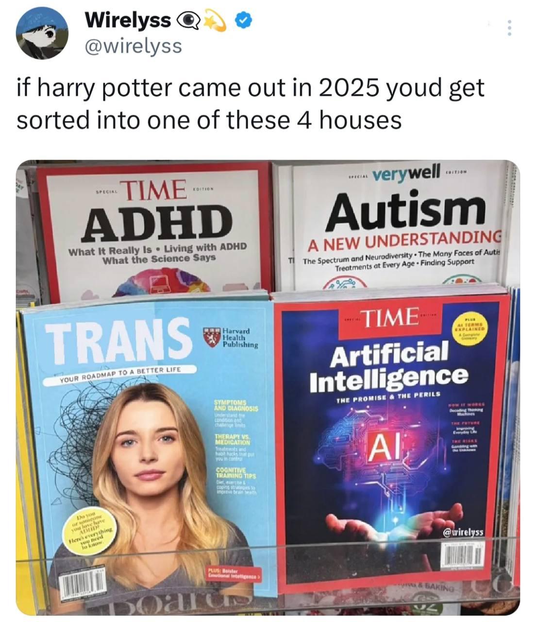 If harry potter came out in 2025 youd get sorted into one of these 4 houses. ADHD. Autism. Trans. Artificial Intelligence.