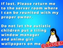 If lost, Please return me to the server room where I can be reunited with my proper owner. Do not let the autistic children put a tiling window manager and anime girl wallpapers on me. Cancer.