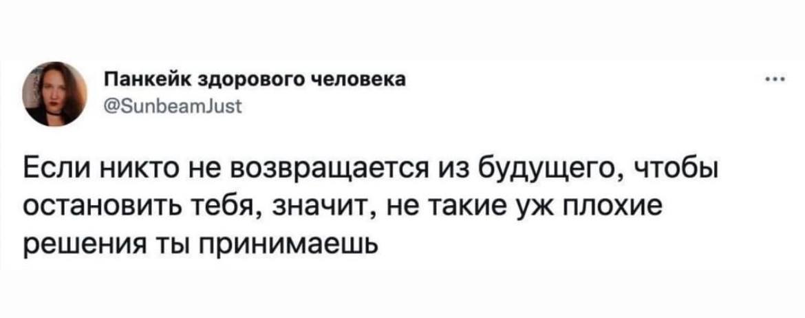 Мем представляет собой скриншот из социальной сети Twitter. На нём изображена аватарка пользователя с именем "Панкейк здорового человека" (@SunbeamJust) и твит, который гласит: "Если никто не возвращается из будущего, чтобы остановить тебя, значит, не такие уж плохие решения ты принимаешь". Этот мем предлагает ироничный взгляд на самооценку и принятие решений, подразумевая, что отсутствие негативных последствий из будущего — это повод не сомневаться в своих действиях. Русский перевод текста: "Если никто не возвращается из будущего, чтобы остановить тебя, значит, ты принимаешь не такие уж плохие решения".